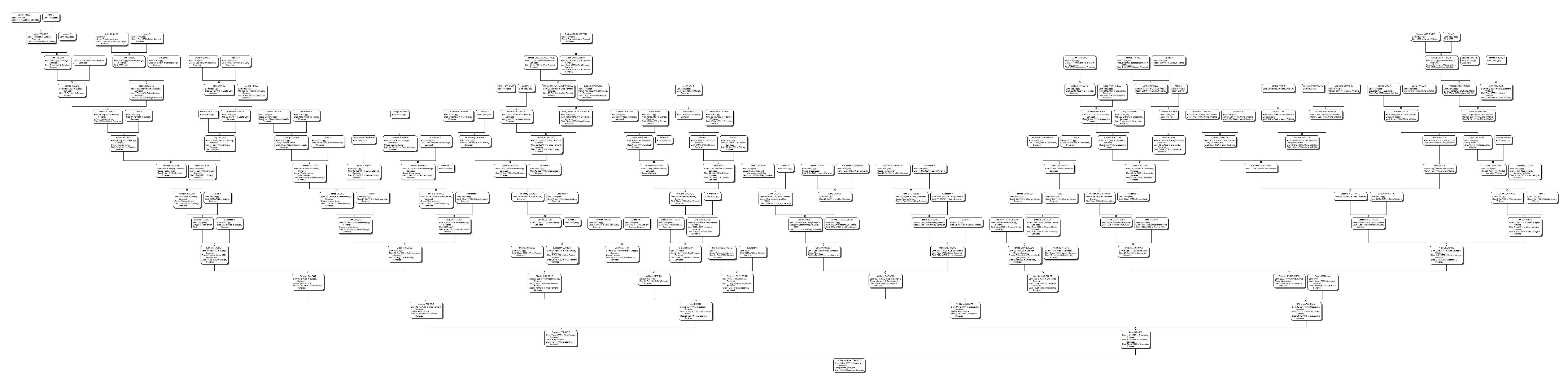 Below is a link to information on the Talbot family lines. The first document is the family history information (pdf acrobat reader required) of my grandmother Hebe Talbot of Somerset. Then there is the family tree picture of her father William Talbot of Croscombe and her mother Emma Jane Talbot. That is followed by the family tree of Emma's great grandmother Grace Connock (see also under 'English Civil War documents' for information about Grace Connock's ancestry). The dates shown are those when the tree pictures were printed and so they are correct according to the research as at that time.
